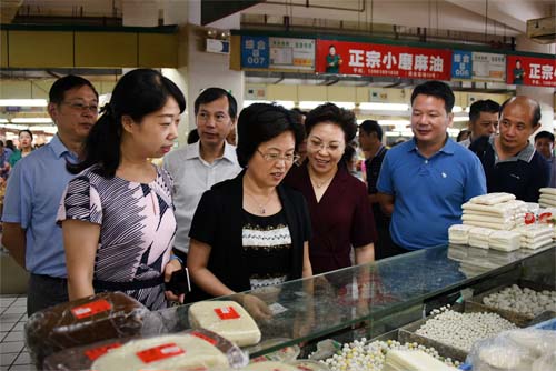 中秋、國慶雙節(jié)臨近,9月13日(農(nóng)歷八月十三)上午,無錫市副市長華博雅帶領(lǐng)市食藥監(jiān)局、市農(nóng)林局、市商務(wù)局、市市監(jiān)局、市糧食局等領(lǐng)導(dǎo)一行,來到朝陽農(nóng)貿(mào)市場視察節(jié)日期間“菜籃子”供應(yīng)情況。 華市長一行在無錫朝陽集團董事長張君君、總經(jīng)理楊興德及梁溪區(qū)有關(guān)部門負責(zé)人的陪同下,詳細查看了市場蔬菜、水果、水產(chǎn)、肉類、糧油等重點農(nóng)副產(chǎn)品的供應(yīng)情況,查看了二樓天惠超市朝陽店平價商品的供應(yīng)情況。華市長邊走邊看,有時會駐足與市場攤主親切交談,詳細了解攤位商品的貨源情況、質(zhì)量情況和價格行情。  華市長還非常關(guān)心農(nóng)副產(chǎn)品的安全問題,在聽取了集團領(lǐng)導(dǎo)有關(guān)市場肉菜溯源體系建設(shè)、食品質(zhì)量安全保障等方面的工作匯報后,華市長隨機抽取了一張黃瓜的購物票據(jù),并在溯源查詢機上順利查詢到了該黃瓜的交易信息和源頭產(chǎn)地信息?!?p align="center"> 節(jié)日里的朝陽農(nóng)貿(mào)市場,各類農(nóng)副產(chǎn)品琳瑯滿目、供應(yīng)充足,買菜人群更是熙熙攘攘、熱鬧非凡,一派節(jié)日繁榮的景象。華市長充分肯定了朝陽農(nóng)貿(mào)市場為保障節(jié)日農(nóng)副產(chǎn)品供應(yīng)量足價穩(wěn)所做的工作,肯定了市場在肉菜溯源體系建設(shè)、嚴格把關(guān)食品質(zhì)量、保障菜籃子安全放心所做的成績,希望市場能夠繼續(xù)加強食品質(zhì)量檢測,穩(wěn)定市場物價,保障市場供應(yīng),確保消費者買得放心、吃得放心,更好滿足市民的節(jié)日消費需求。