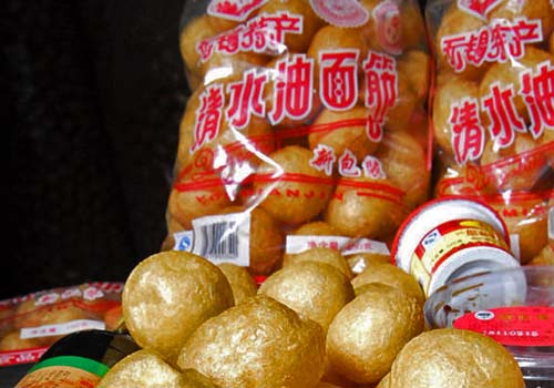 這里銷售的油面筋都是全純素制品,采用純素油氽制而成。成品面筋顏色金黃,用手指捅一下面筋,你會(huì)發(fā)現(xiàn)里面蜂窩異常緊密。因?yàn)樗玫挠土先繛閮羲赜,面筋光亮薄而透明,所以又稱清水油面筋。