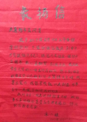 表揚(yáng)信 天惠超市五河店: 我于2017年2月19日上午在你店購物時(shí),不慎將錢包丟失,到中午才發(fā)現(xiàn)錢包不見了,錢包內(nèi)有現(xiàn)金(數(shù)千元)、銀行卡、票據(jù)等。我心急如焚,到處尋找,最后我?guī)е鵁o望的心情去你店詢問,想不到你店的黃美華同志撿到錢包后正等待失主呢。我喜出望外,想拿些錢以表謝意,可黃美華一再婉言謝絕我的好意。 我對黃美華同志這種拾金不昧、做好事不求回報(bào)的高貴品質(zhì)深受感動(dòng),特此致信深表感謝! 失主:朱二妹 2017年2月20日