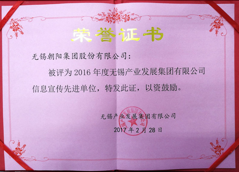 無錫朝陽集團被評為“2016年度無錫產(chǎn)業(yè)發(fā)展集團有限公司信息宣傳先進單位”