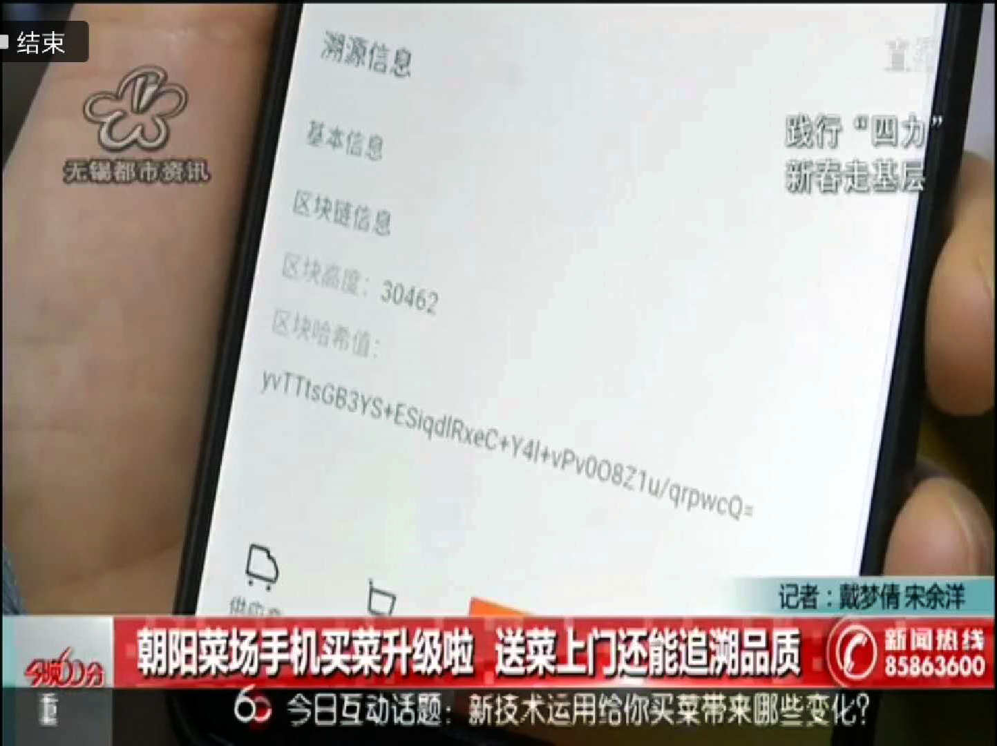2月12日晚,無錫電視臺都市資訊頻道《今晚60分》欄目播放了“朝陽菜場手機(jī)買菜升級啦 送菜上門還能追溯品質(zhì)”的新聞,介紹朝陽到家APP的便民服務(wù)優(yōu)勢和區(qū)塊鏈技術(shù)優(yōu)勢。(鴻雁)