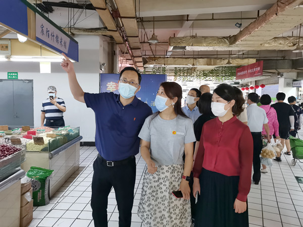 | 7月31日上午,無錫市商務(wù)局汪行局長、梁溪區(qū)商務(wù)局陳萍局長一行7人到無錫朝陽農(nóng)貿(mào)市場檢查新冠病毒疫情防控工作,無錫朝陽集團張君君董事長陪同領(lǐng)導(dǎo)們來到各個區(qū)域進(jìn)行檢查。 在蔬菜區(qū),張君君董事長向領(lǐng)導(dǎo)們詳細(xì)地匯報了朝陽農(nóng)貿(mào)市場關(guān)于新冠病毒防控措施的落實情況,包括門崗掃碼、測溫、檢查口罩、核酸檢測、疫苗接種等。 在家禽區(qū)、水產(chǎn)區(qū)、百貨區(qū)等區(qū)域現(xiàn)場,汪局和經(jīng)營戶進(jìn)行了親切的交流,詢問市場的價格行情,連聲表示朝陽農(nóng)貿(mào)市場價格實惠,便民惠民。 在“三悅空間書吧”,詢問了市場去年改造項目的相關(guān)事宜,對在人頭攢動的菜場內(nèi)植入文化元素、提供公共文化服務(wù)表示稱贊。 汪行局長對朝陽農(nóng)貿(mào)市場的疫情防控工作和內(nèi)部改造工作表示肯定,要求市場全力以赴做好防控保供工作。(華艷)