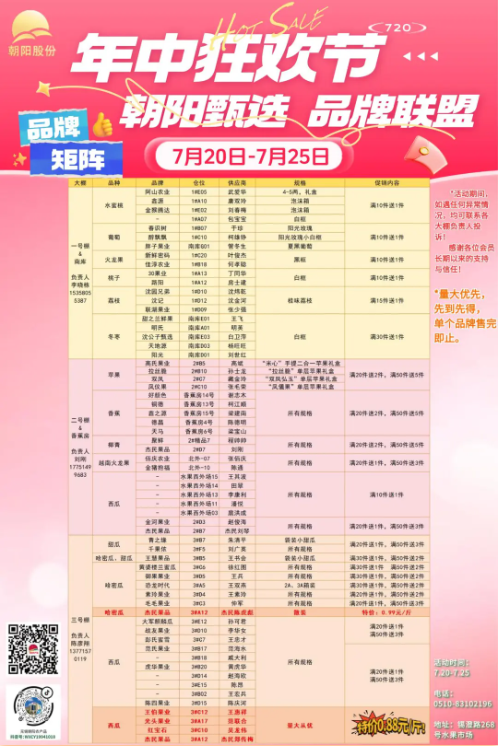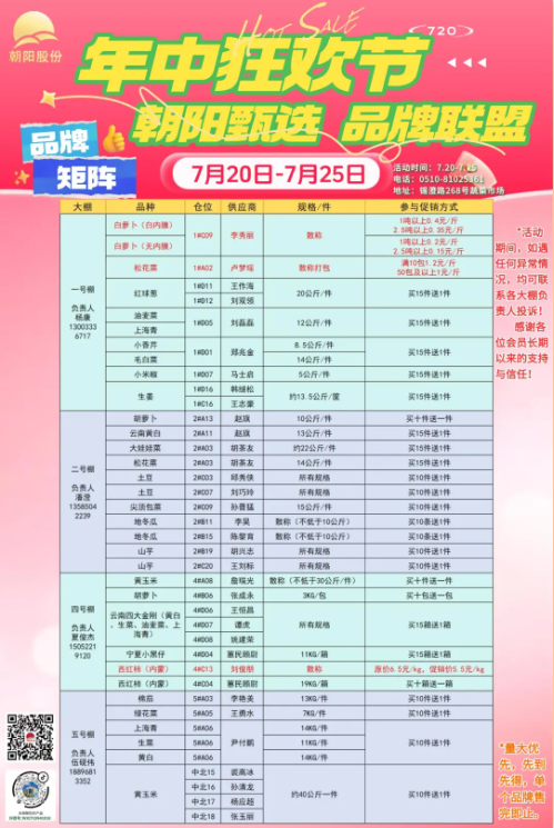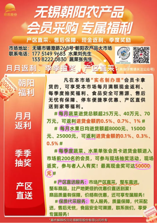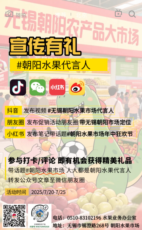 無錫朝陽農(nóng)產(chǎn)品大市場 朝陽菜果 年中狂歡節(jié) 盛大開啟! 會員采購 專屬福利:產(chǎn)區(qū)直送服務(wù)、保質(zhì)代采服務(wù)、售后保障、現(xiàn)金返利、季度獎勵。 無錫朝陽農(nóng)產(chǎn)品產(chǎn)區(qū)直采服務(wù)火熱進行中,整車直送,百億補貼!更低的價格、更高的品質(zhì)、更全的保障! 高溫橙色預(yù)警! 急需補充一點能量! 無錫朝陽農(nóng)產(chǎn)品大市場 年中狂歡節(jié) 品牌矩陣大集合,會員尊享! 超多水果蔬菜品牌大促 更有西瓜0.88元/斤、 哈密瓜0.99元/斤、 白蘿卜0.15元/斤、 松花菜1元/斤 快來搶購吧! 宣傳有禮! 成為朝陽水果代言人! 抖音:發(fā)布朝陽采購視頻,帶 #無錫朝陽水果市場代言人話題, 并且艾特@無錫朝陽農(nóng)產(chǎn)品 抖音官方。 朋友圈:轉(zhuǎn)發(fā)促銷活動朋友圈,帶 無錫朝陽水果市場定位 小紅書:發(fā)布筆記話題,一起來聊一聊朝陽, 并帶 #朝陽水果市場年中狂歡節(jié)話題。 發(fā)布抖音視頻,艾特官方, 即有機會被抽中,贈送精美禮品! 快快加入!為朝陽打call! |